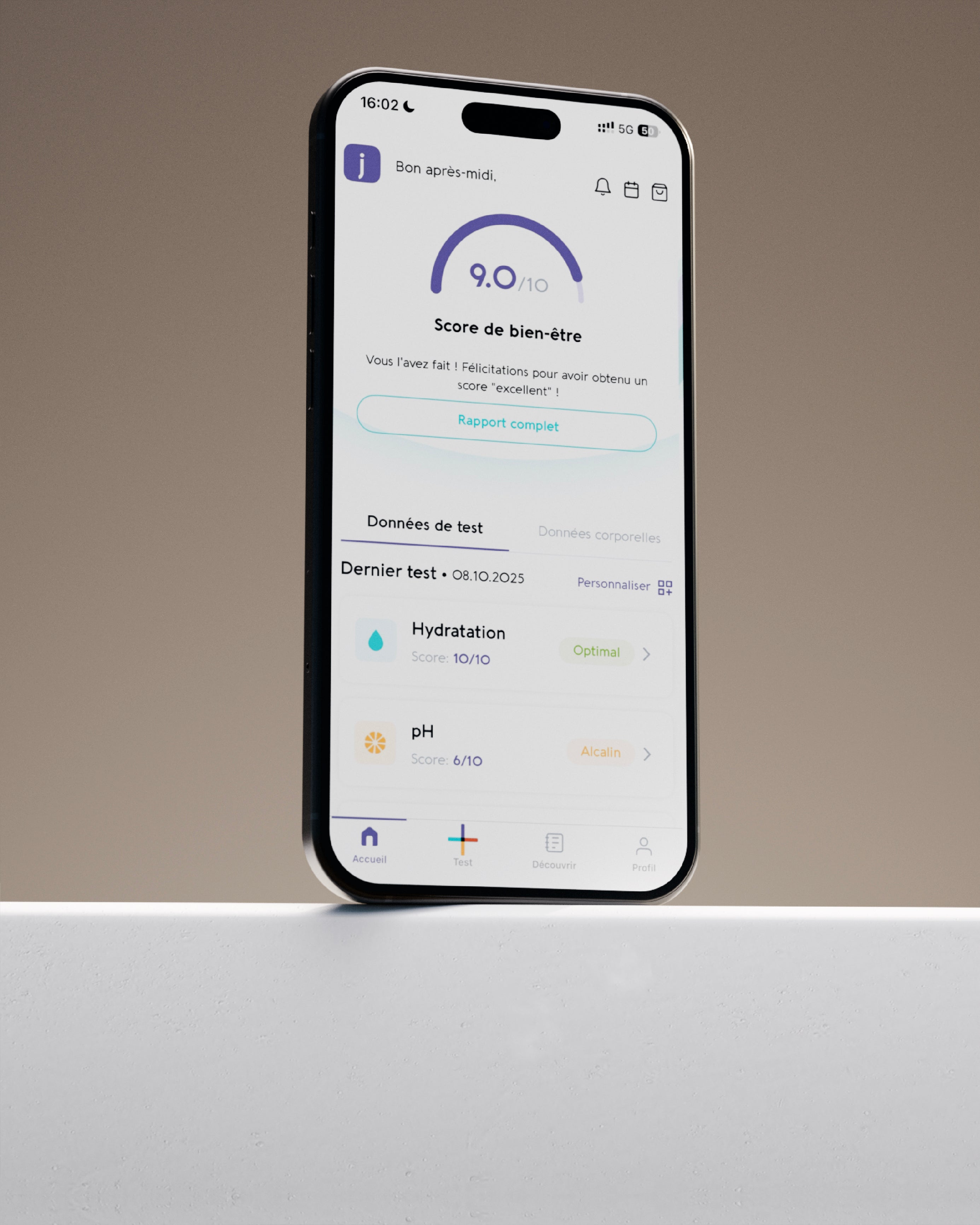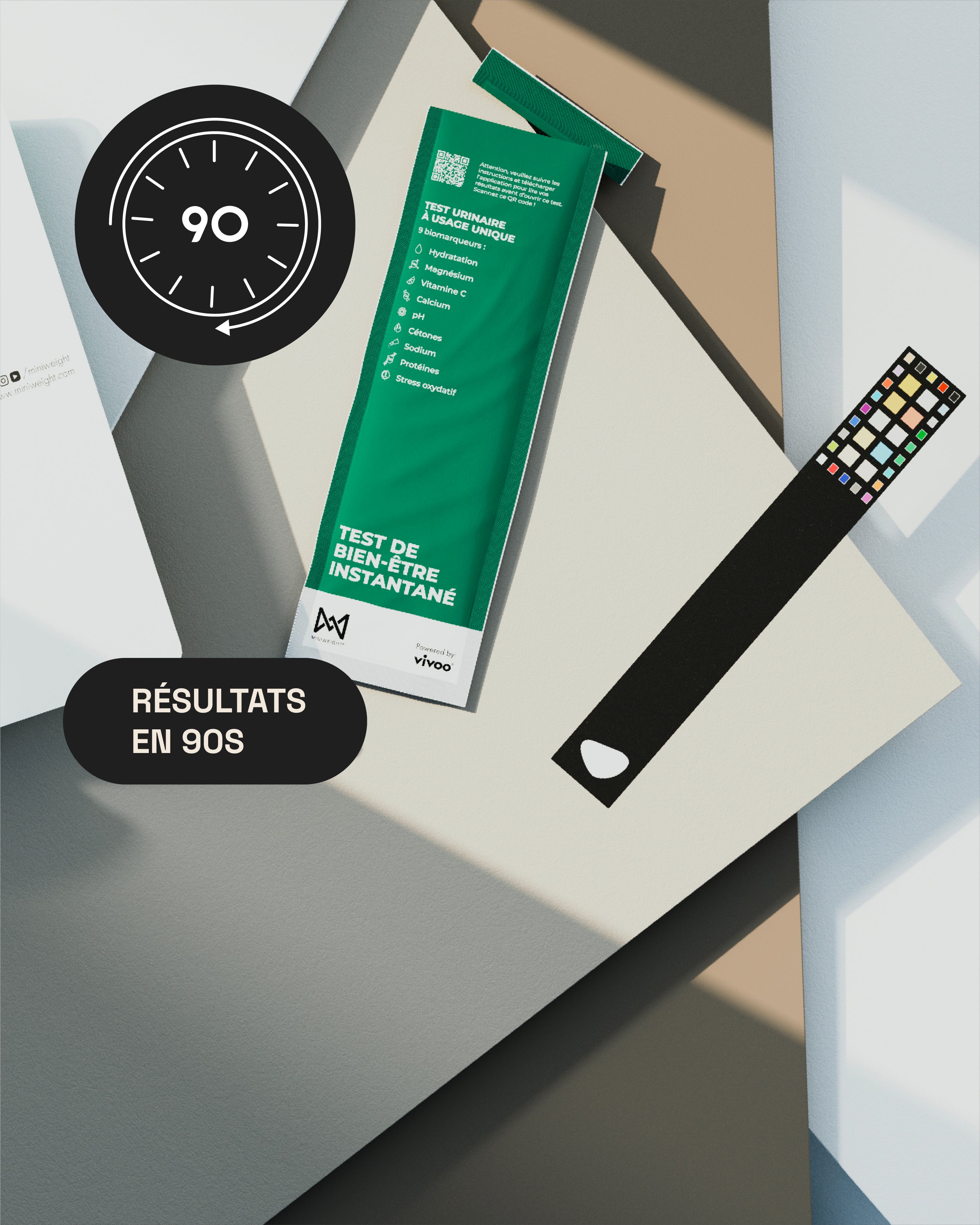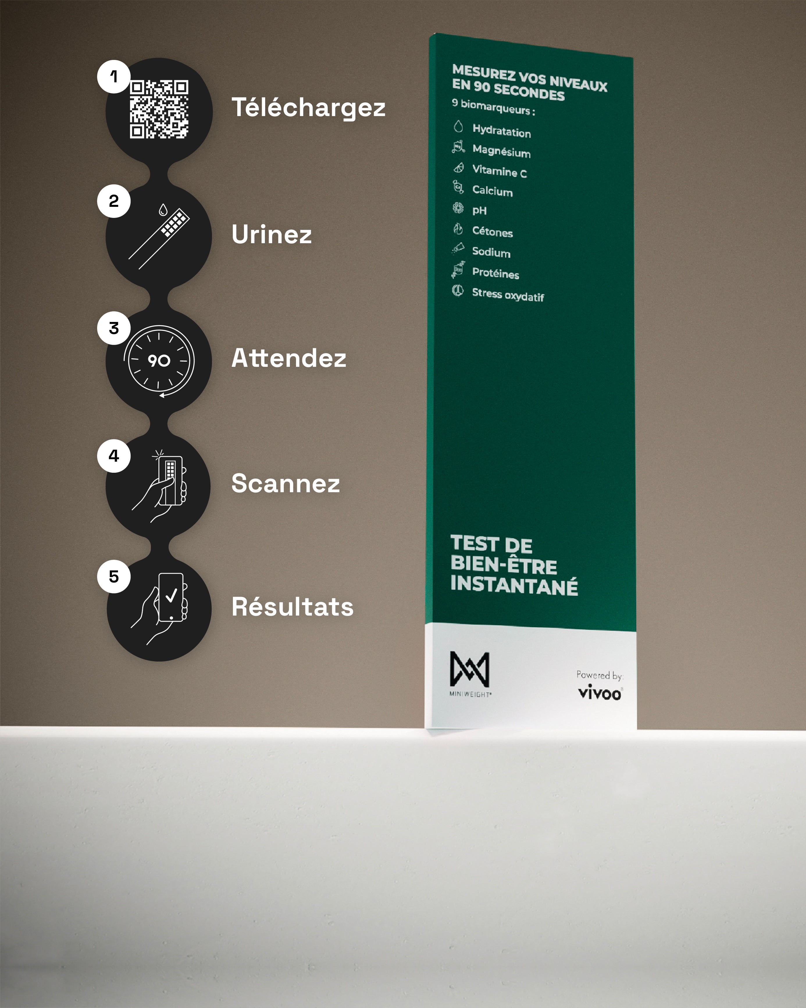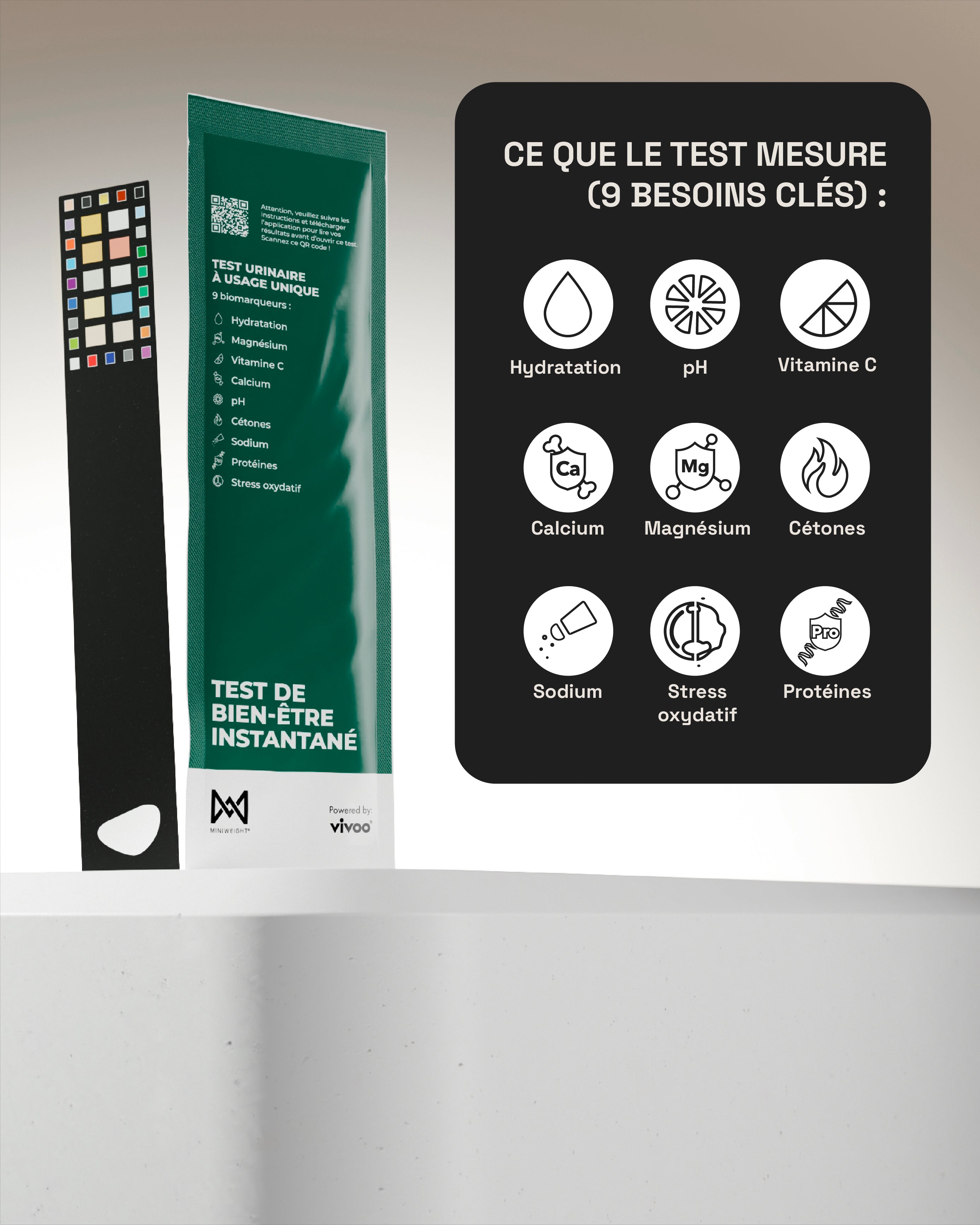 En un seul test, vous mesurez 9 paramètres clés de votre bien-être : hydratation, magnésium, calcium, vitamine C, protéines, pH, sodium, cétones et stress oxydatif.