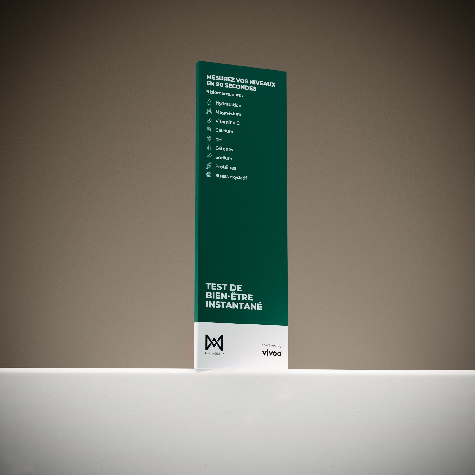 En un seul test, vous mesurez 9 paramètres clés de votre bien-être : hydratation, magnésium, calcium, vitamine C, protéines, pH, sodium, cétones et stress oxydatif.